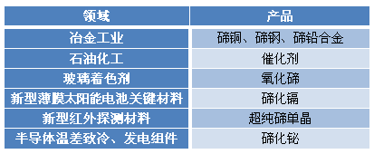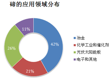 早期的碲应用比较局限。在二次世界大战期间,碲是作为硫化剂用于天然橡胶生产,直到20世纪50年代后期才成为一种具有工业实用价值的元素。碲及其化合物应用广泛,其下游行业包括太阳能、合金、热电制冷、电子、橡胶等行业,下游行业的发展状况直接决定碲的需求量。目前碲化镉薄膜太阳能行业发展迅速,被认为是最有发展前景的太阳能技术之一,预计随着碲化镉薄膜太阳能行业的发展,碲的需求将持续高速增长。